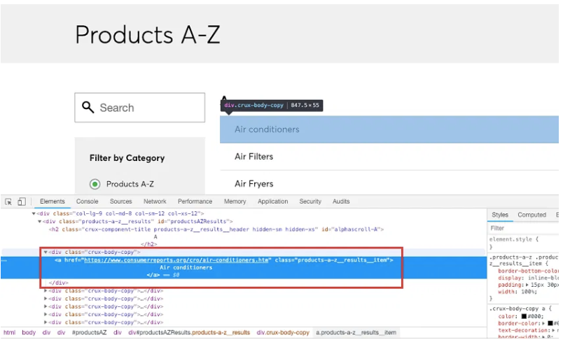 user_agent = UserAgent() url = "https://www.consumerreports.org/cro/a-to-z-index/products/index.htm"
